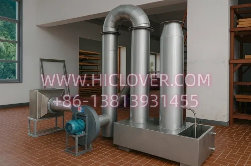 The flue gas filtration system is designed for final-stage exhaust gas purification. It removes fine dust and mist particles through a multi-stage process that includes extreme cooling spray treatment, dust removal, demisting, and stainless-steel mesh filtration. The process ensures clean, purified flue gas discharge that meets environmental emission standards.